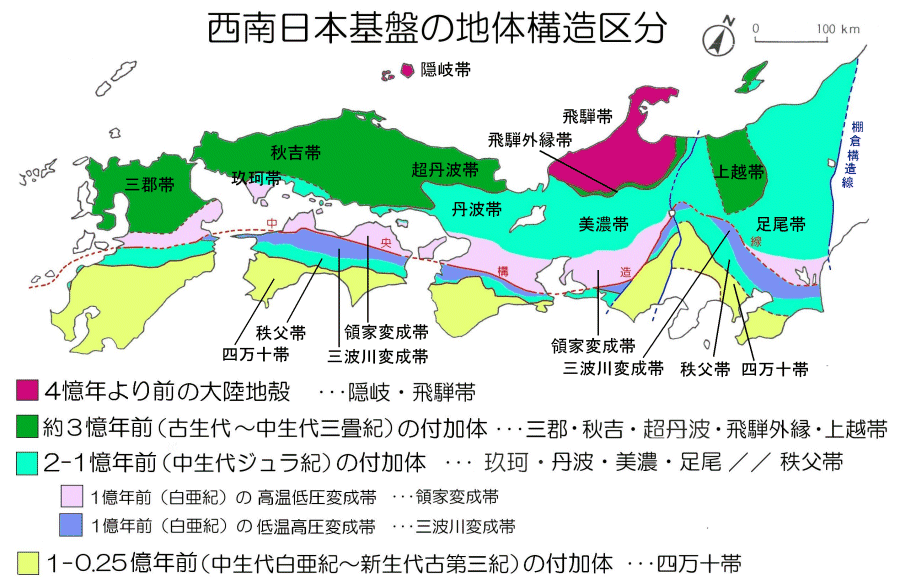 これで見る限り、東端の構造線は茨城県の三波川帯の切れ目を通る。それってつまり三波川青石=緑色片岩の切れ目がずれているおで、ここでいびつにつながったことが見えてるんだよね。だから筑波に行けばその切れ目が見えるところがあるはずなんだ。