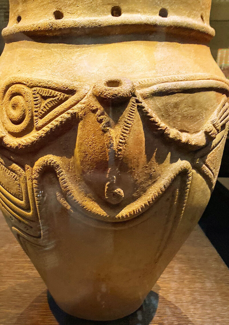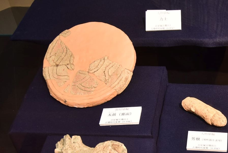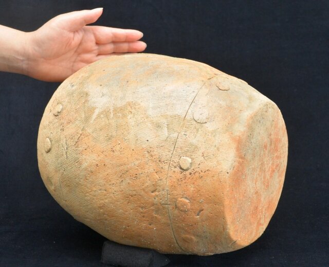 ※古墳からはこれまで破片出土が3例(今城塚古墳、宮崎県新富町百足塚むかでづか古墳など)あるが、完形出土は初。長野県茅野市尖石遺跡 有孔鍔付土器 太鼓 縄文時代