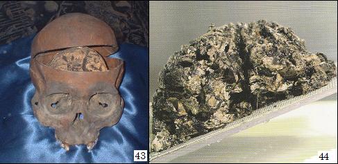 なかには銅の鏃が打ち込まれた人骨盤や鋭い刃物で切りつけられた胸椎、殺傷痕のある頭蓋骨もある。